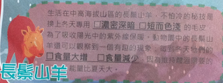 生活在中高海拔山區的長鬃山羊,不怕冷的秘技是換上冬天專用濃密深暗毛皮,為了吸收陽光中的紫外線保暖。動物園中的長鬃山羊還可以觀察到一個有趣的現象,每到冬天,牠們的食量大增,因為維持體溫需要的能量比夏天大。