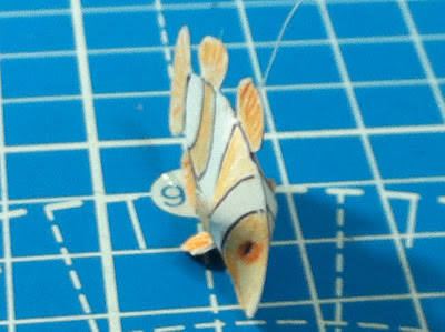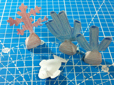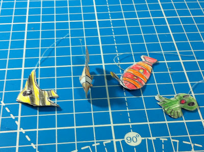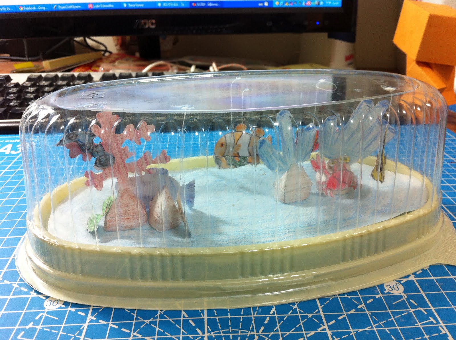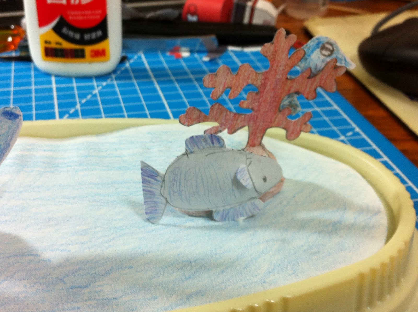 勞作要求要做成3d立體,還要是日常會丟棄的東西來做,最後只好把早上吃完的蛋糕盒拿來當容器,在裡面擺上一堆魚和水草做成水族箱的樣子。