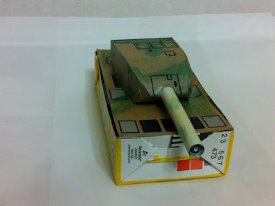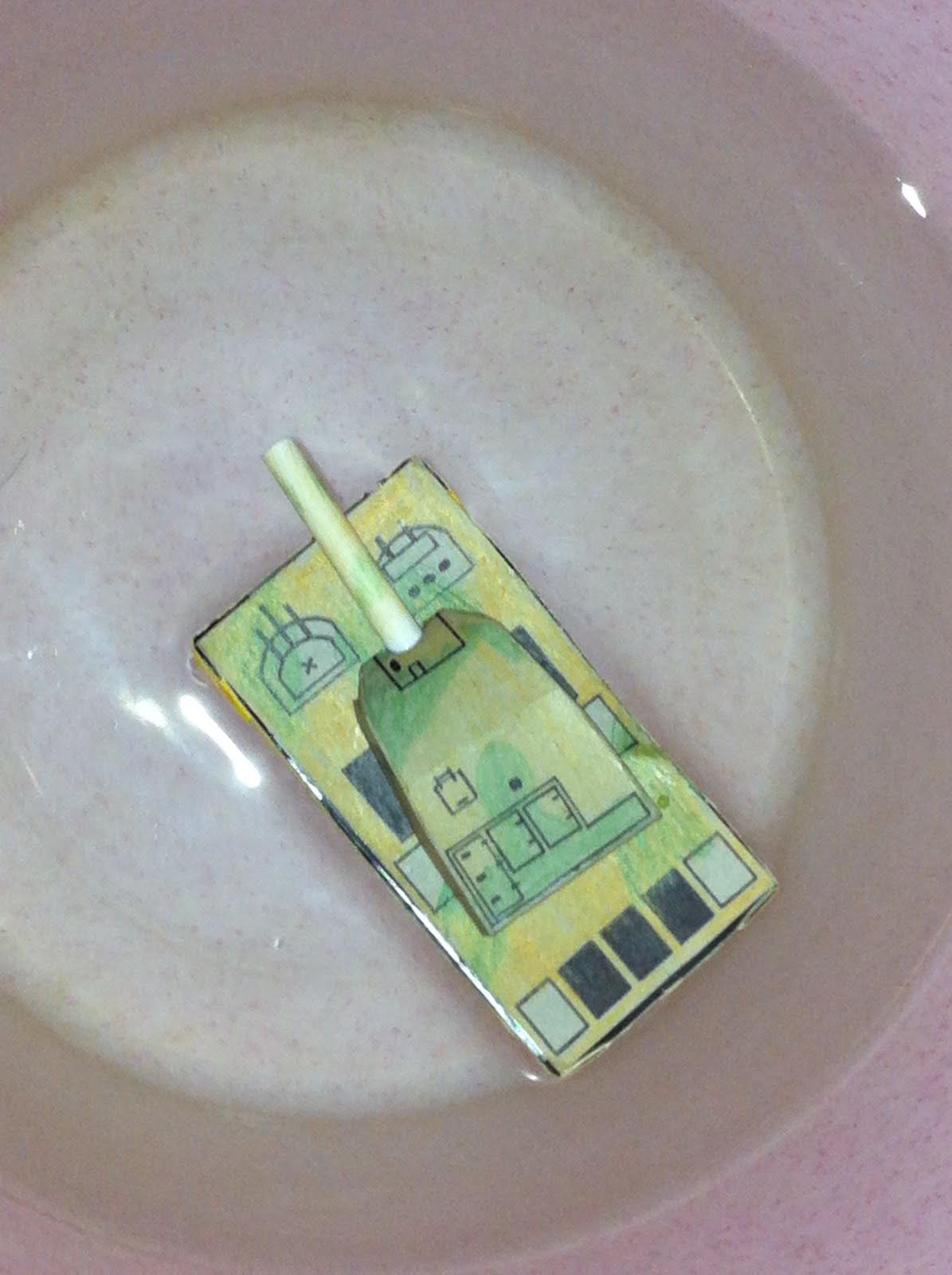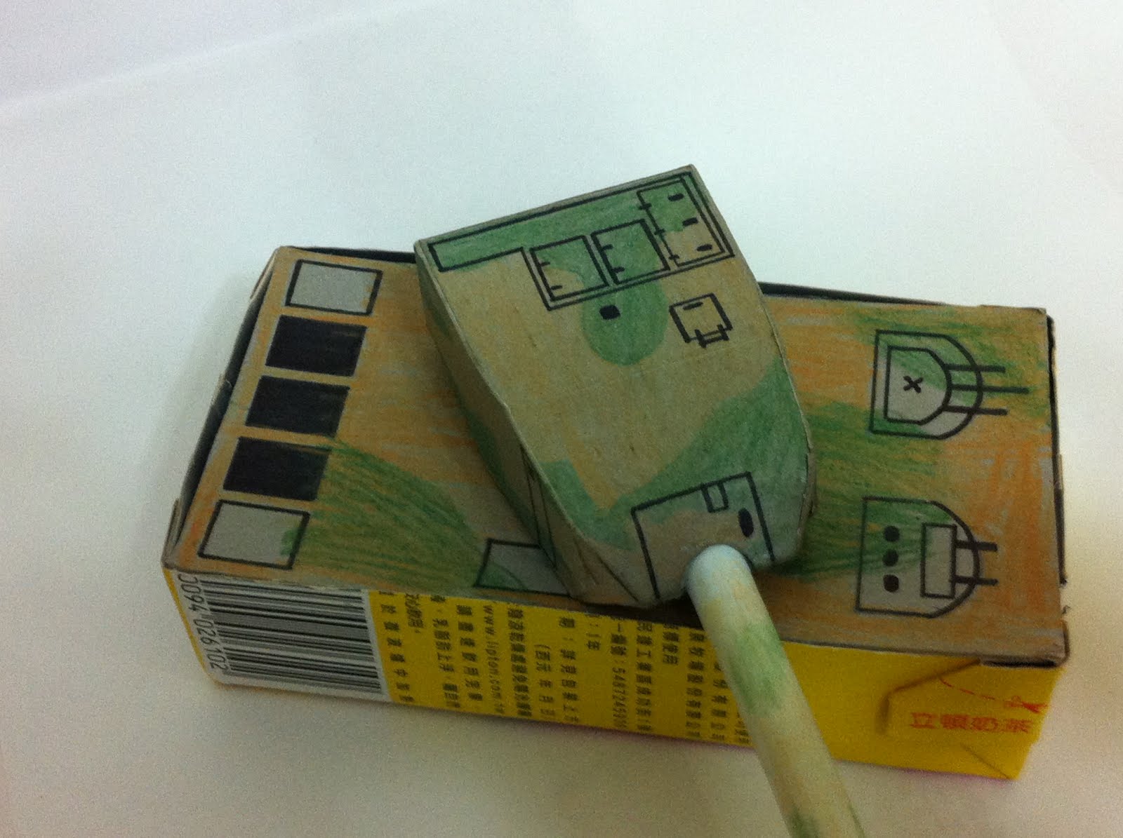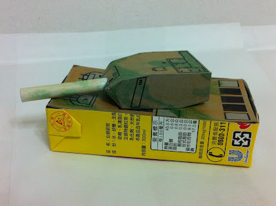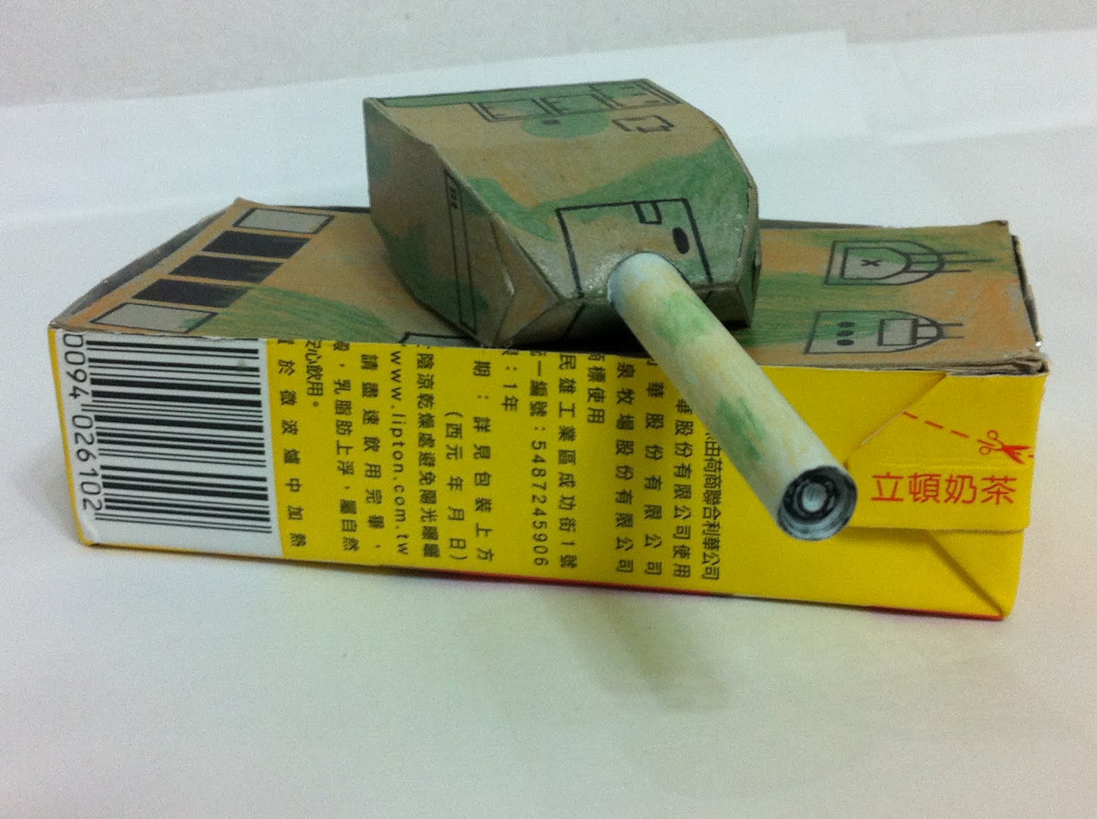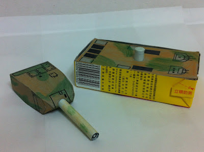 奶茶的紙盒拿來做船身,這樣成品就能下水了,最後決定加個砲台來個坦克船