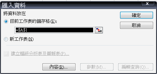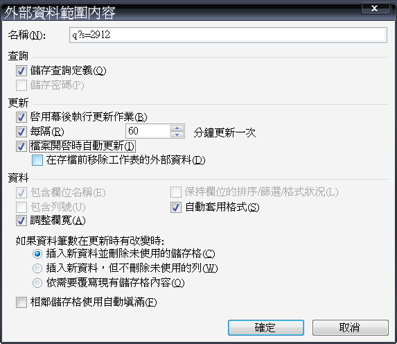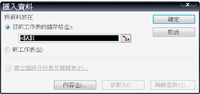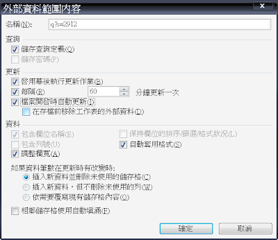 今天稍微嘗試研究了一下,excel 匯入外部資料的功能,真的蠻有用的,有的時候,開一個 excel 檔案比開一個網頁方便多了。