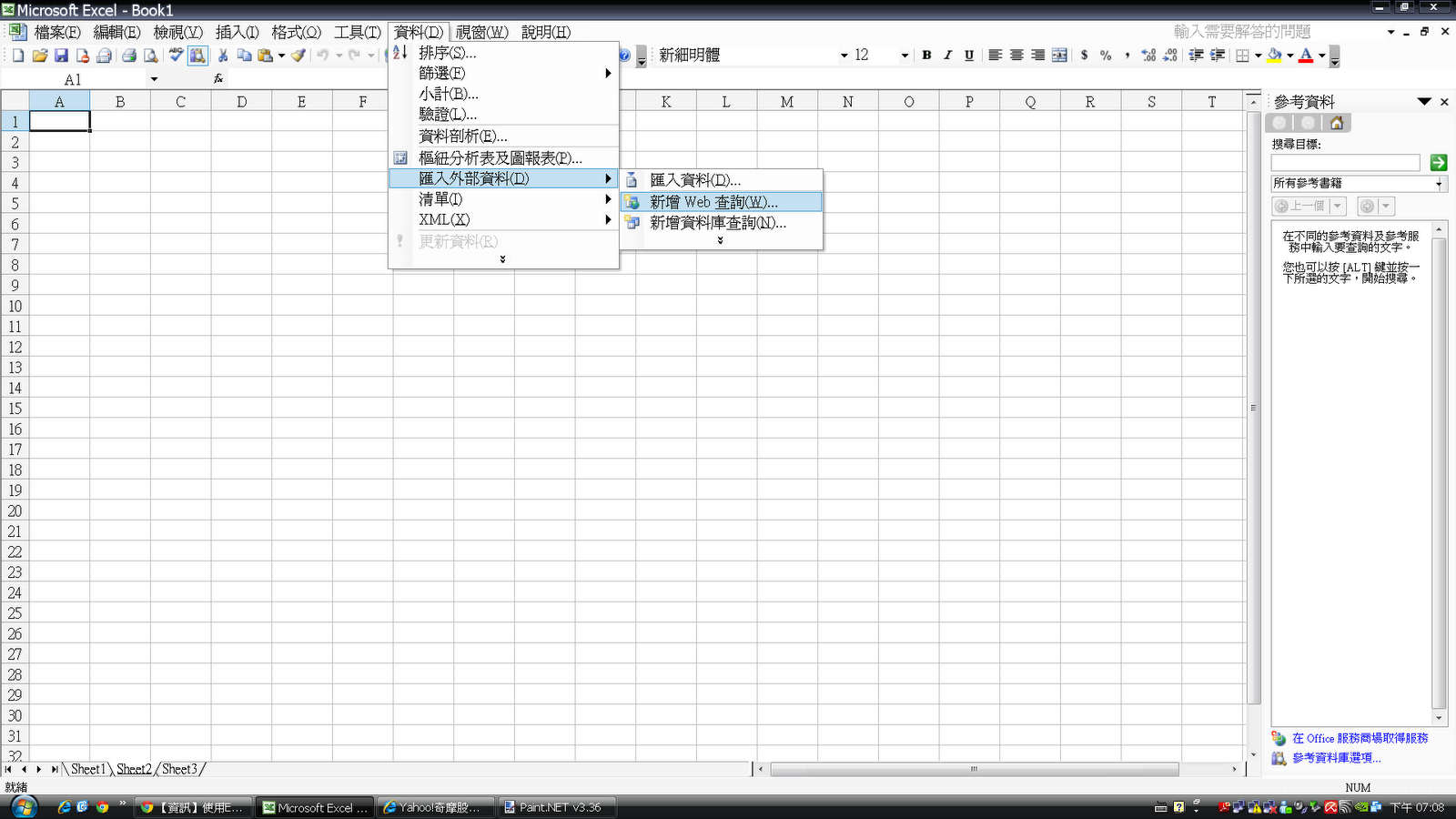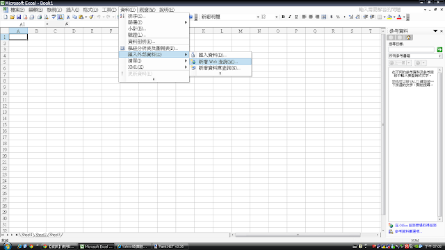 - 開啟 excel 後,選擇 A1 欄位,『資料』-> 『匯入外部資料』 -> 『新增 Web 查詢』。