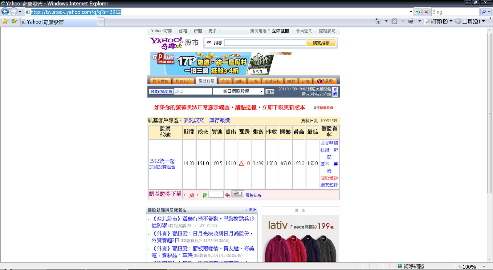 - 從瀏覽器查詢要取得資料的網站網址。例如雅虎的股票網站中的一檔股票:統一超。把網址複製起來