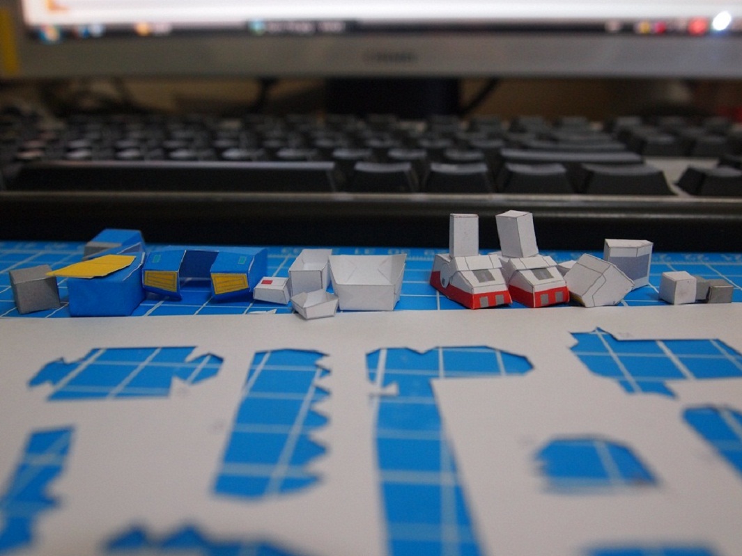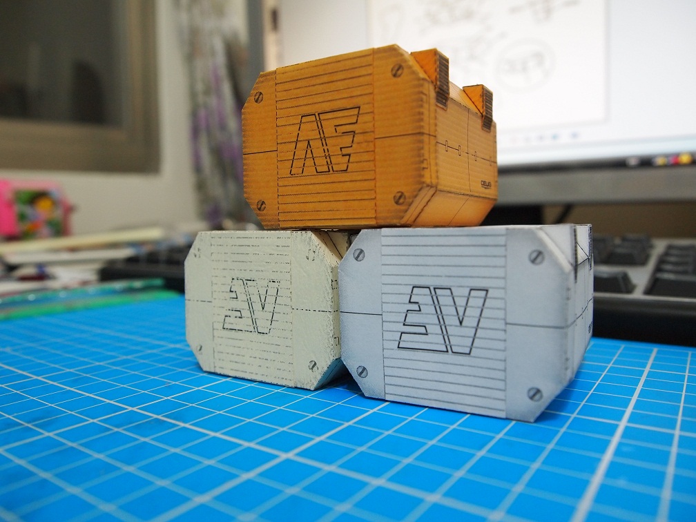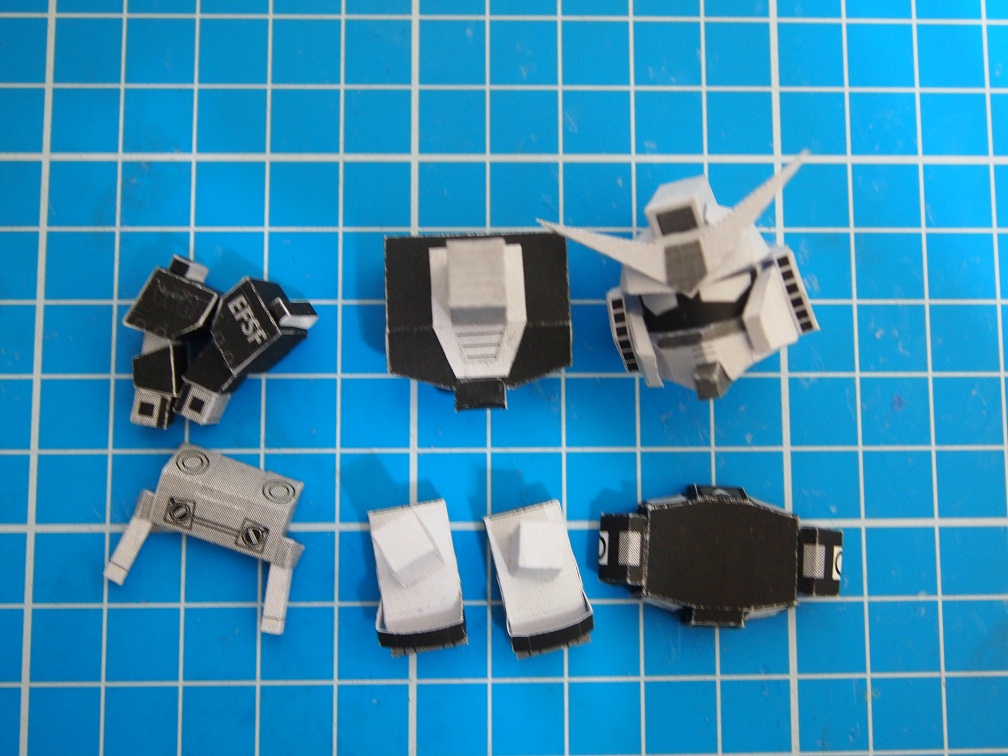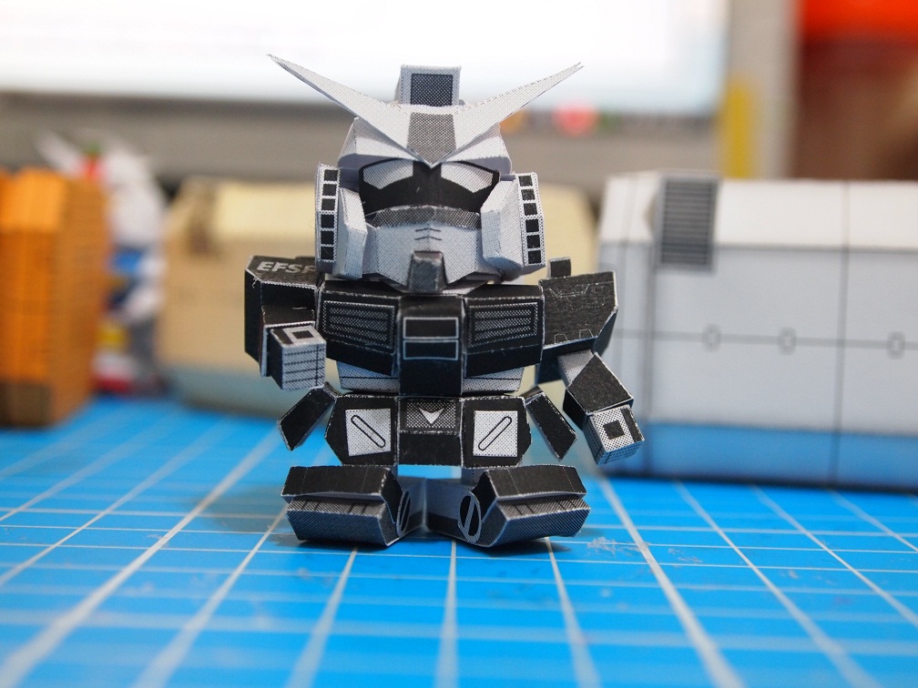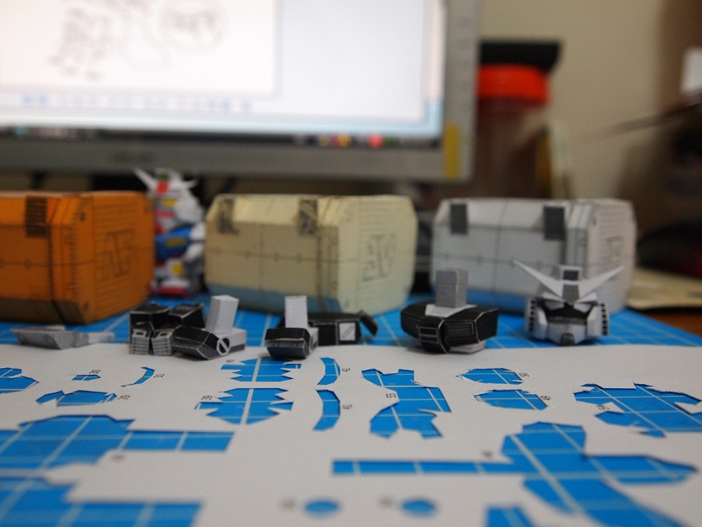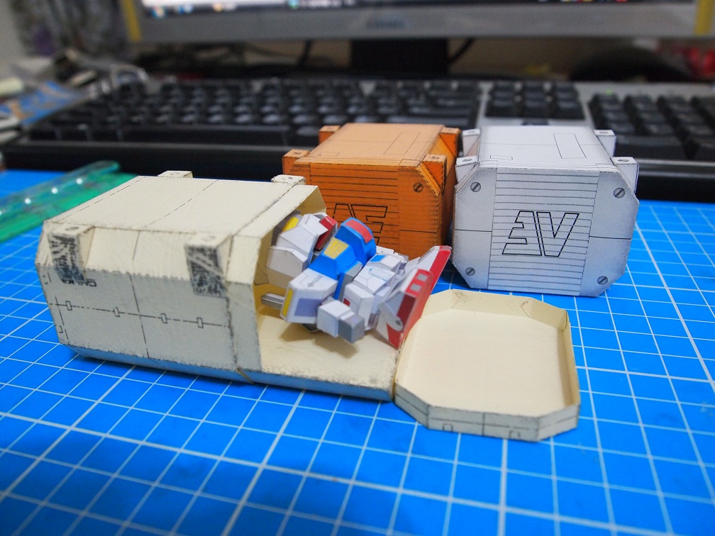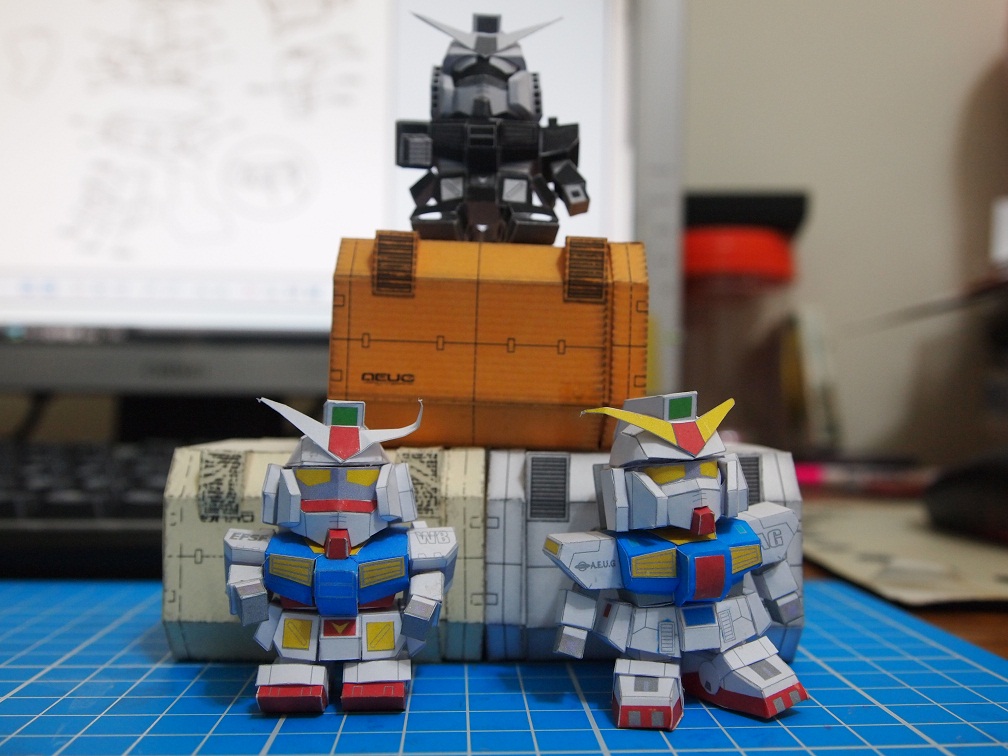 非常小巧可愛的小鋼彈,每隻一完成,就被小孩拿去玩了,回來照相時,天線都歪了。每隻小鋼彈都是一張圖紙就可以完成了,將成品圖給了作者,他還寄了鋼彈箱圖紙給我,做完後,這樣每個小鋼彈都有一個家了。
