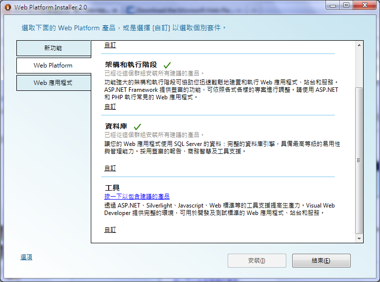 Web Platform包含Web 平台的基本元件。再新功能頁面找到想要安裝的Visual Web Developer 2010 Express。