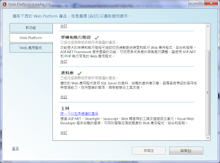 以第二種方式順利安裝了 Visual C# Express 2010及 Visual C++ Express 2010後,再要安裝Visual Web Developer 2010 Express時,網頁上卻提醒要先安裝Microsoft Web Platform Installer (WebPI),這是什麼,記得以前不用的,果然曬網太久了,資訊還真的跟不上,@@