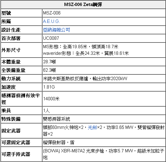 MSZ-006,作為Ζ計劃的完成品,是軍火巨頭阿納海姆公司自γ鋼彈(RMS-099 Rick Dias)以來,所完成的第4部鋼彈級MS,被賦予希臘字母 ζ 的代號(拉丁字母轉寫為Zeta)。最初建造的3台原型機為MSZ-006-X1、MSZ-006-X2和MSZ-006-X3。這些機體的結構設計為可以變形,但是遇到了不可克服的金屬疲勞問題足以導致機身解體。這個問題後來由於從擄獲的RX-178中得到可動骨架的技術以及為A.E.U.G.作戰的新人類駕駛員卡缪·比丹的修正而解決了。MSZ-006成為UC歷史上第一架具有大氣圈突入及大氣機動能力的TMS(可變機動戰士 transformable mobile suits),可以從MS形態轉為類似太空梭的「waverider」形態。供給卡繆使用的原型機操作系統中裝有測試中的「生化感應器」,類似於NT專用的設計,可能藉由駕駛的精神狀態解除機體限制。
