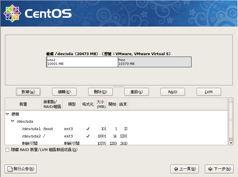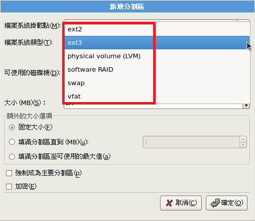 ● ext2/ext3:是Linux檔案系統類型。ext3多了日誌的記錄, 對於系統的復原比較快速,建議務必選擇新的ext3不要再用ext2了。