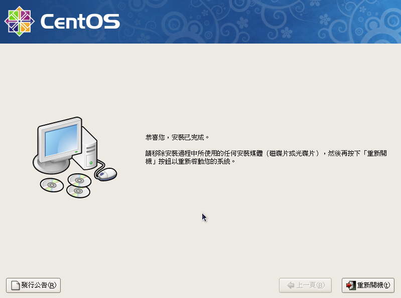 安裝完成,退出安裝光碟,按『重新開機』。