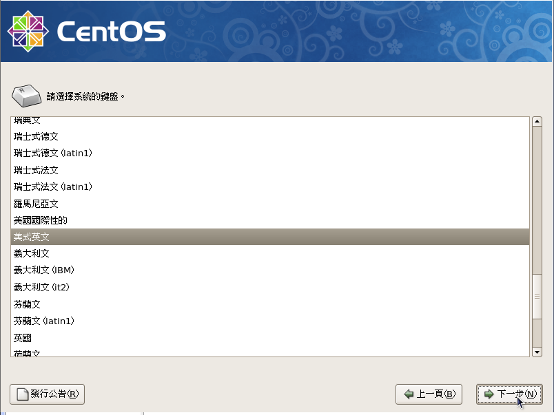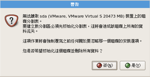 鍵盤字元對應表請選擇『美式英文』,按『下一步』進入下一個程序,此時如果是全新的硬碟會出現一個警示畫面,按『是』就可以了;如果硬碟原本有其他軟體,請選擇安裝CentOS的選項,此後硬碟裡的原內容將會消失。