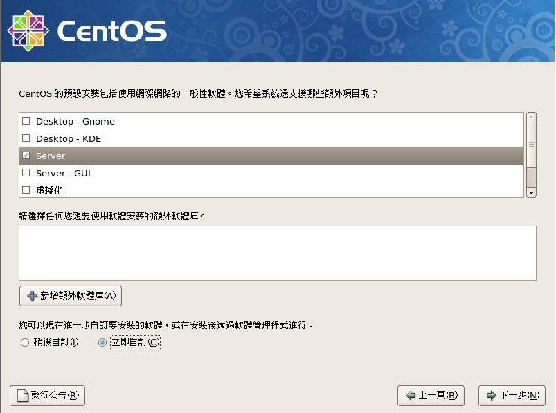勾選想要安裝的各軟體,如是第一次安裝,全部勾選安裝是個不錯的選擇,勾選『立即自訂』,按『下一次』進入自訂軟體選擇畫面。