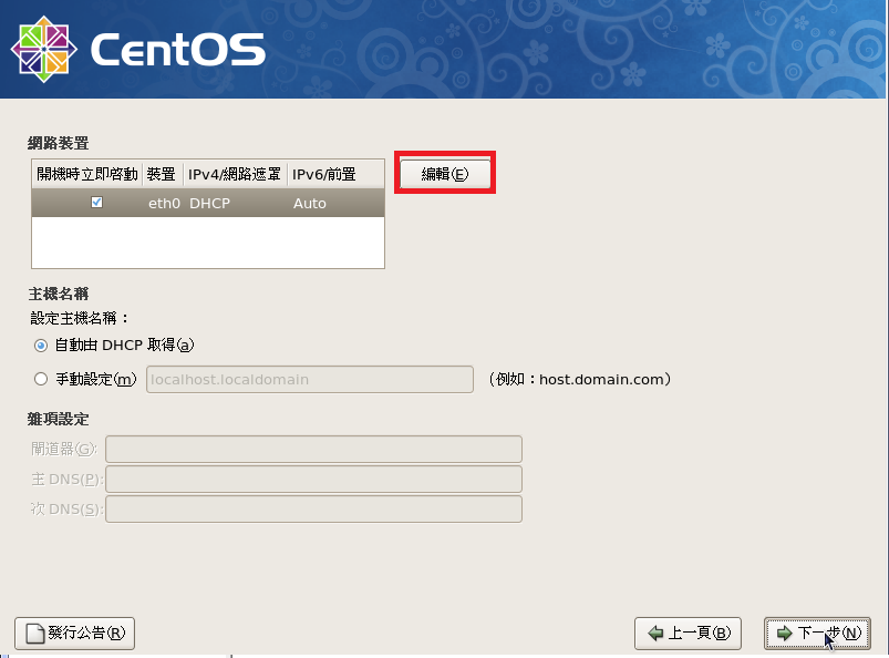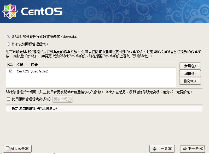 無特殊需求時,此畫面不需要變動,如要變更開機選單名稱,請點選 CentOS 標籤,按『編輯』可進入選單編輯作業,或按『下一步』進入下一個安裝程序。