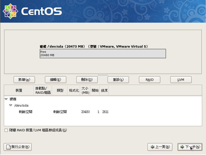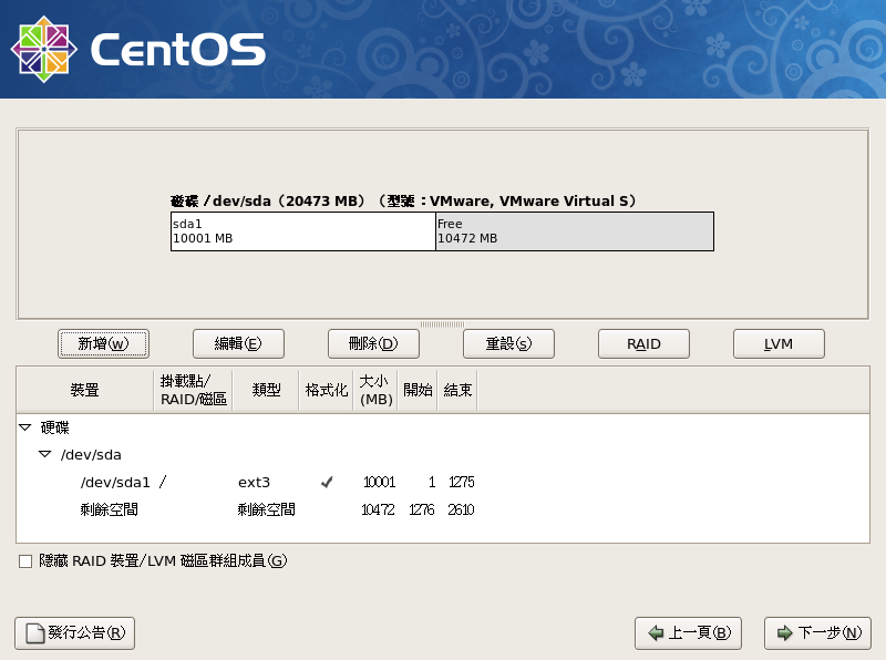 大小,請選擇適合你硬碟的合理大小,一般是記憶體的兩倍,只是現在記憶體都很大了,一般設定後,系統用不太到,按『確定』來完成/目錄的分割,如下圖所示: