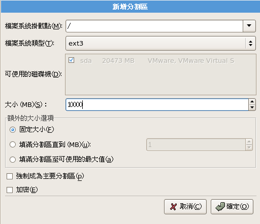大小,請選擇適合你硬碟的合理大小,並請選擇『強制成為主要分割區』後,按『確定』來完成/目錄的分割,如下圖所示: