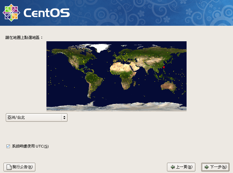 時區請選擇所在的時區,如亞洲/台北,系統時鐘使用UTC(修正:不要使用utc,因會造成時間誤差,每次重開都要重新設定時間),按『下一步』進入下一個程序。