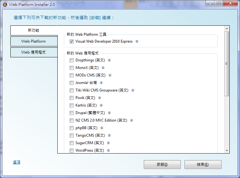 Web Platform包含Web 平台的基本元件。再新功能頁面找到想要安裝的Visual Web Developer 2010 Express。