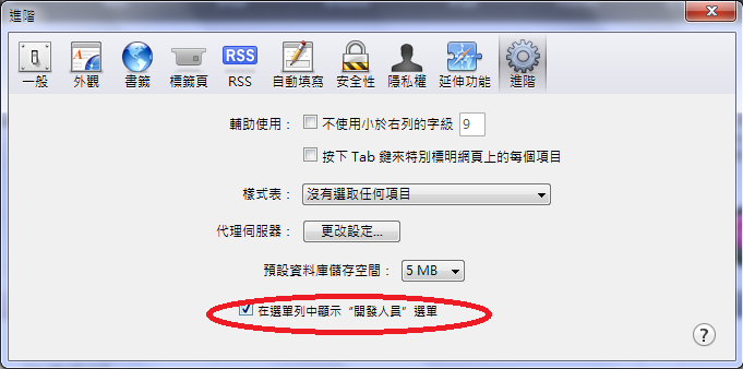 3. 在 Safari 瀏覽器的選單列選擇「編輯」->「偏好設定」,在其進階選單頁面,開啟「開發人員」的功能表後,才能在選單列中看到「開發人員」這個選項。