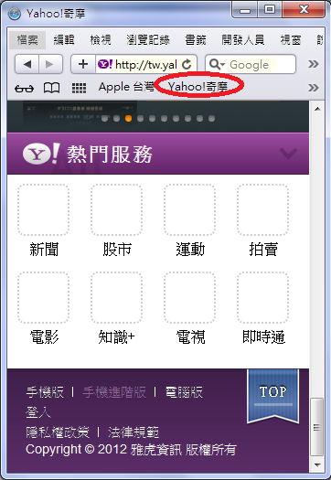 5. 快速驗證,選擇瀏覽器上的Yahoo!奇摩,應該就可以看到手機版的Yahoo!奇摩的網頁