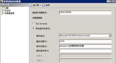 連結的伺服器: 填入這個連結的名稱,例: ORACLELNK