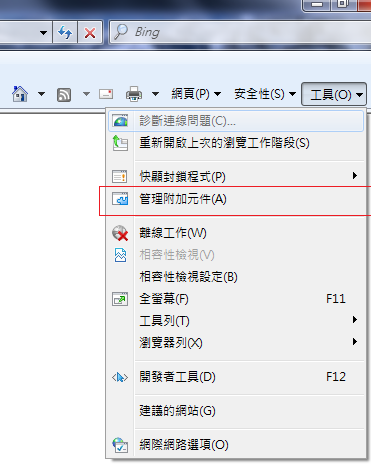 Windows Internet Explorer 1. 點選 工具->管理附加元件