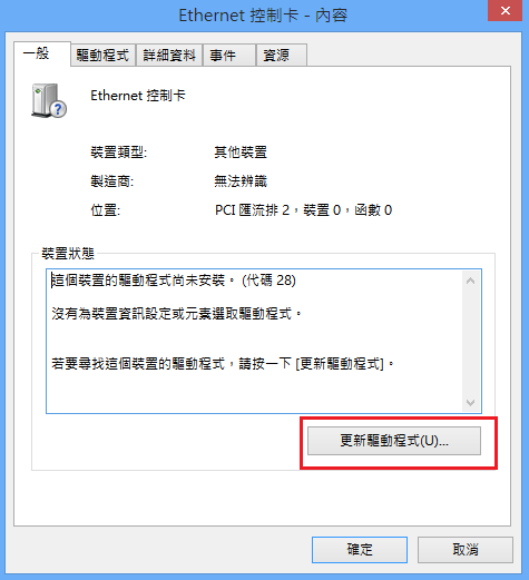 滑鼠雙擊[Ethernet 控制卡],打開視窗後,點選右下角的[更新驅動程式]