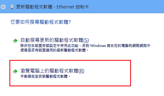 選則[瀏覽電腦上的驅動程式軟體],找到剛剛用 7-zip 解壓縮的 driver 目錄來安裝新的驅動程式。