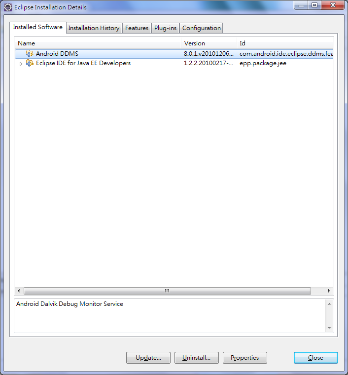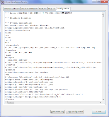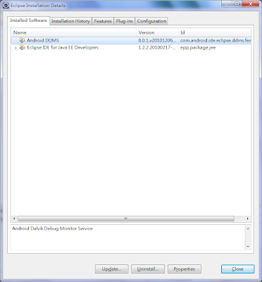 在跳出的 Eclipse Installation Details 視窗中,選擇要移除的 plugin ,底下的 Uninstall..按鈕就會 Enable